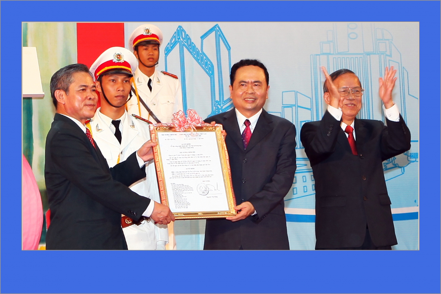 Phó Thủ tướng Trương Vĩnh Trọng trao bằng và quyết định công nhận thành phố Cần Thơ là Đô thị loại 1, trực thuộc Trung ương, ngày 26/8/2009. Ảnh: Hoàng Khiêm