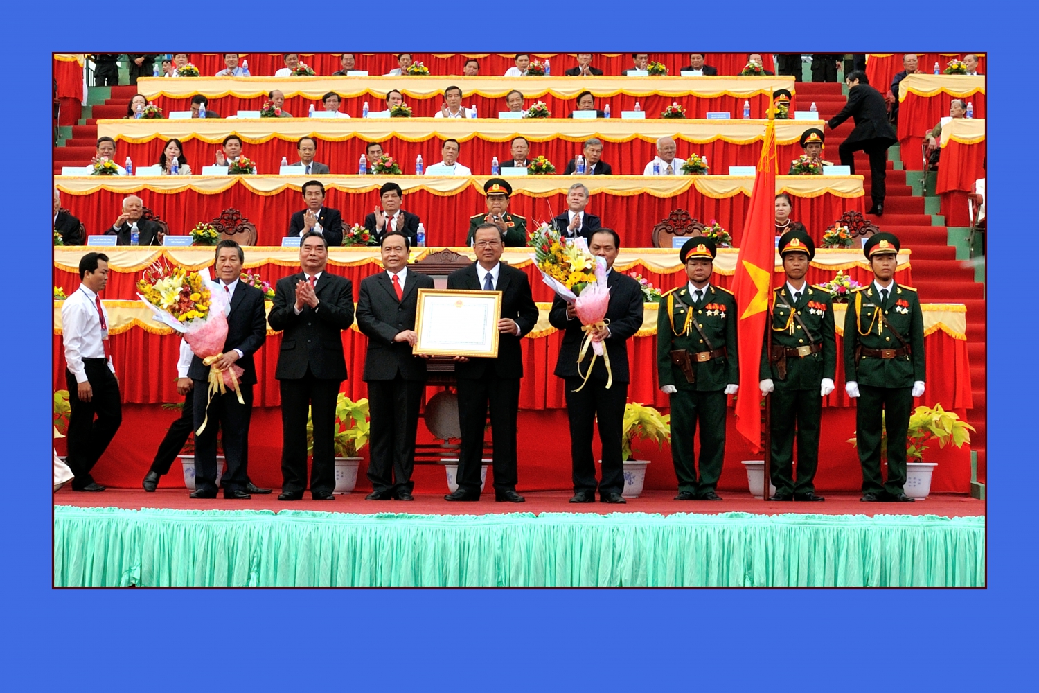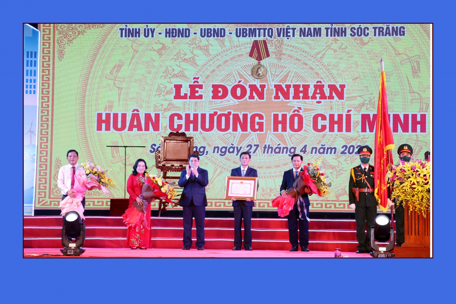 Thủ tướng Phạm Minh Chính trao Huân chương Hồ Chí Minh cho lãnh đạo tỉnh nhân dịp kỷ niệm 30 năm tái lập tỉnh Sóc Trăng tại Quảng trường Bạch Đằng, ngày 27/4/2022. Nguồn: Bảo tàng Sóc Trăng