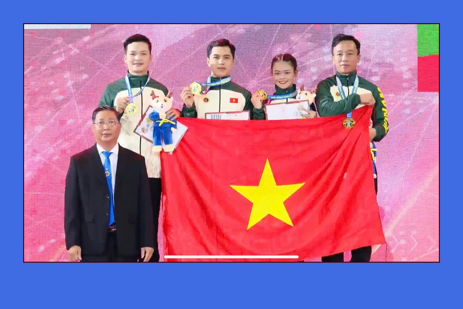 Vận động viên Cần Thơ đạt huy chương vàng tại giải vô địch Vovinam thế giới lần thứ 7 năm 2023, tổ chức tại Việt Nam. Võ sư Võ Hữu Lý chụp ảnh lưu niệm cùng các vận động viên. Ảnh: Anh Tuấn.