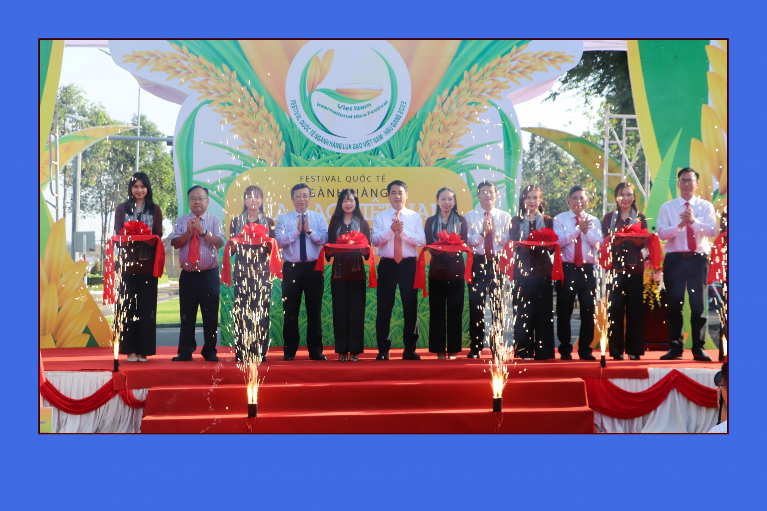 Lãnh đạo Trung ương và lãnh đạo tỉnh Hậu Giang thực hiện nghi thức cắt băng khai mạc con đường lúa gạo Việt Nam tại Festival Quốc tế ngành hàng lúa gạo Việt Nam – Hậu Giang 2023. Nguồn: Bảo tàng Hậu Giang