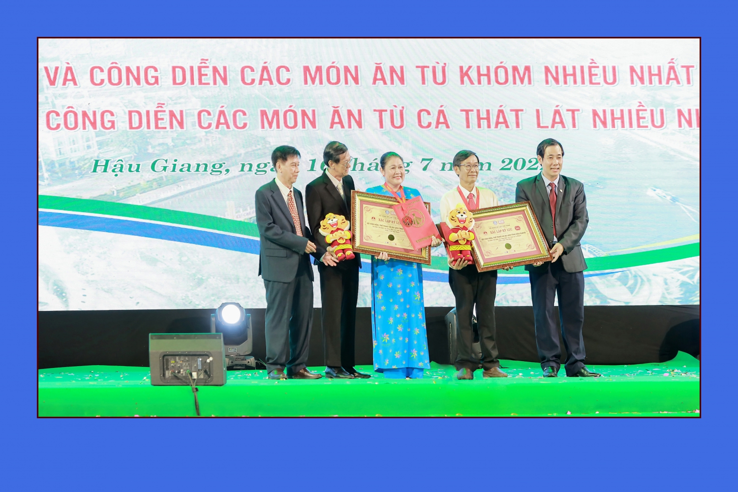 Đại diện Tổ chức kỷ lục Việt Nam trao bằng xác lập kỷ lục về chế biến các món ăn từ cá Thát Lát và Khóm nhiều nhất Việt Nam, hai đặc sản nổi tiếng của Hậu Giang, tháng 7/2022. Nguồn: Bảo tàng Hậu Giang