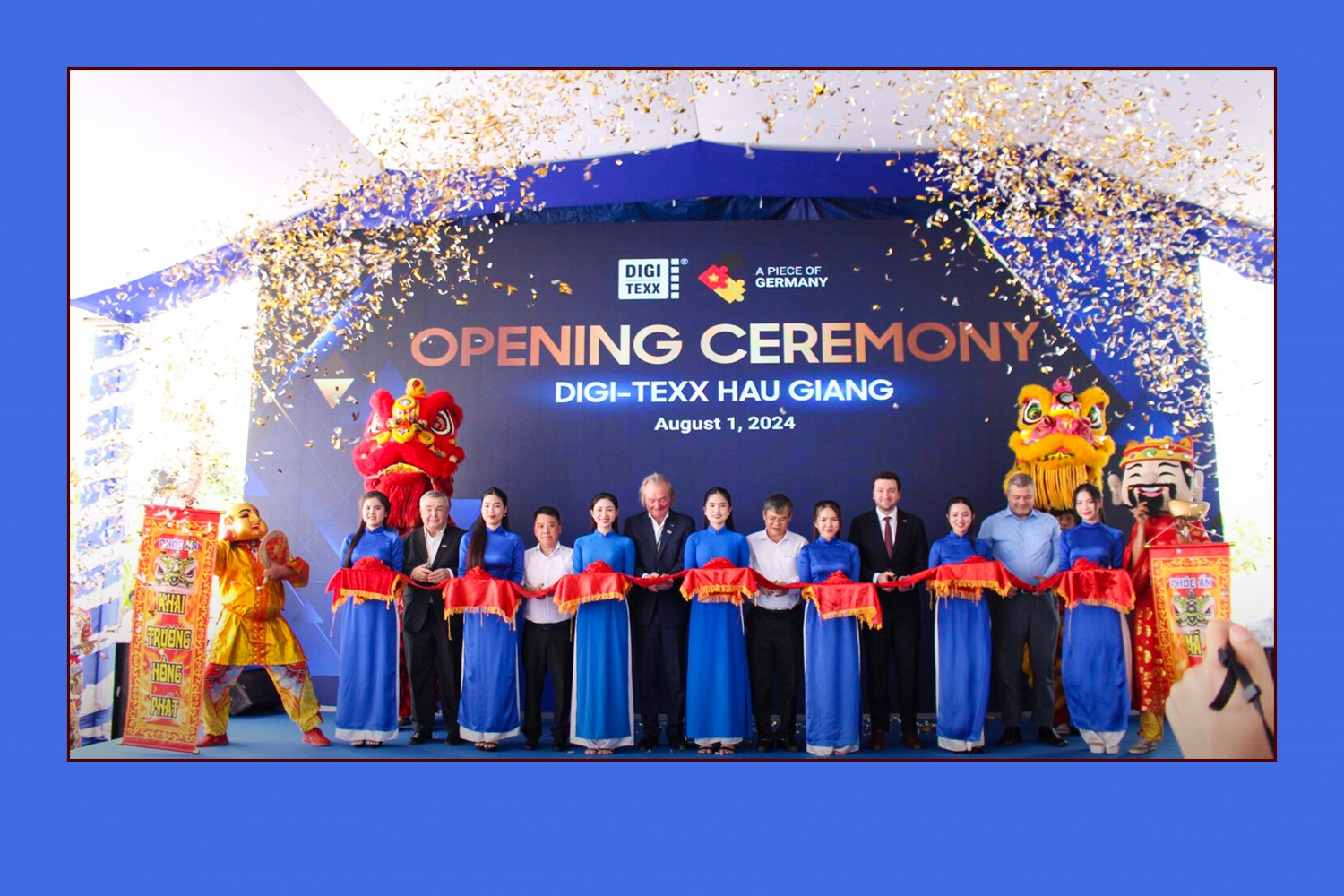 Đại biểu thực hiện nghi thức cắt băng khai trương Digi – Texx Hậu Giang, khu công nghệ số Hậu Giang, tháng 01/2024. Nguồn: Bảo tàng Hậu Giang