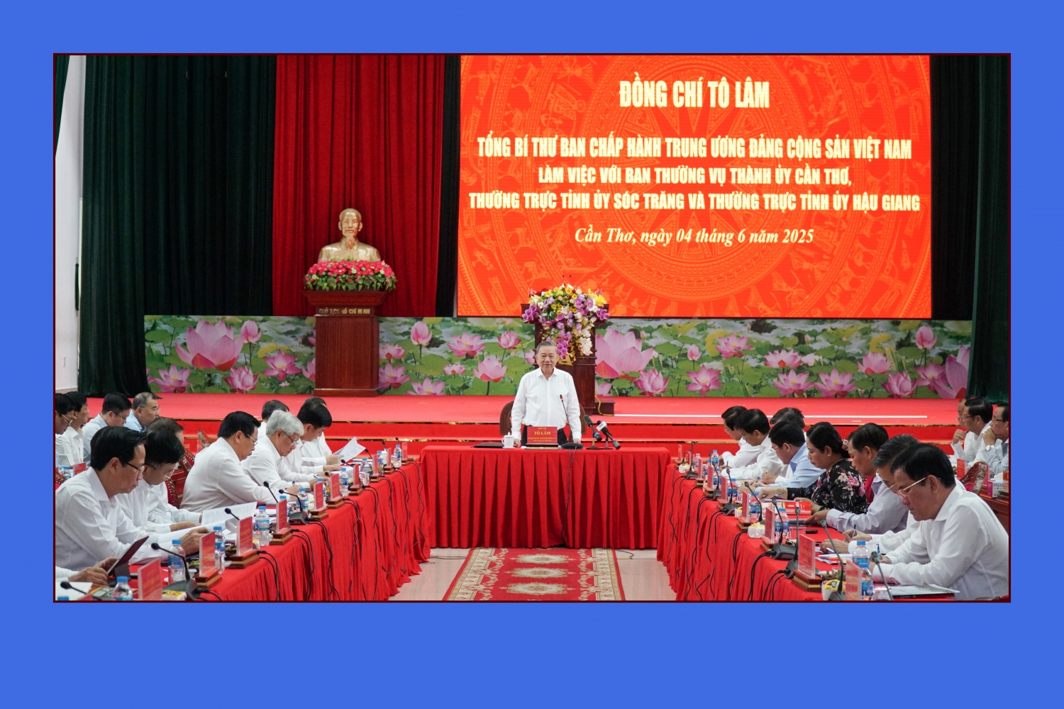 Tổng Bí thư Tô Lâm và đoàn công tác Trung ương làm việc với Ban Thường vụ Thành ủy Cần Thơ và Thường trực Tỉnh ủy Hậu Giang, Thường trực Tỉnh ủy Sóc Trăng về việc triển khai các nghị quyết, kết luận của Trung ương, ngày 4/6/2025. Ảnh: Anh Dũng