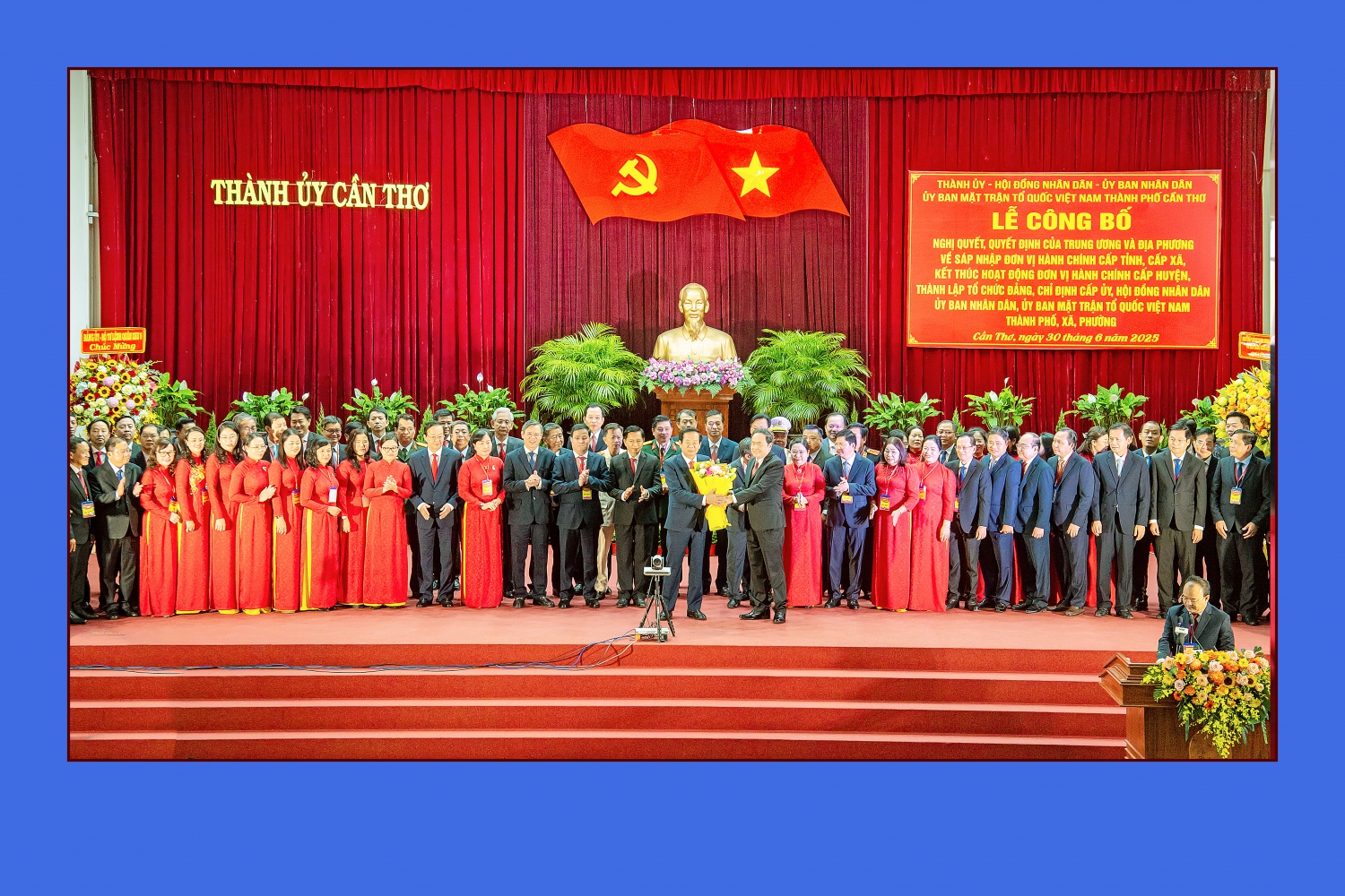 Đồng chí Trần Thanh Mẫn, Ủy viên Bộ Chính trị, Chủ tịch Quốc hội trao các Quyết định của Bộ Chính trị, Ban Bí Thư và tặng hoa chúc mừng Ban Chấp hành, Ban Thường vụ, Bí thư, Phó Bí thư Thành ủy Cần Thơ nhiệm kỳ 2020 – 2025, ngày 30/6/2025. Ảnh: Hồng Phú
